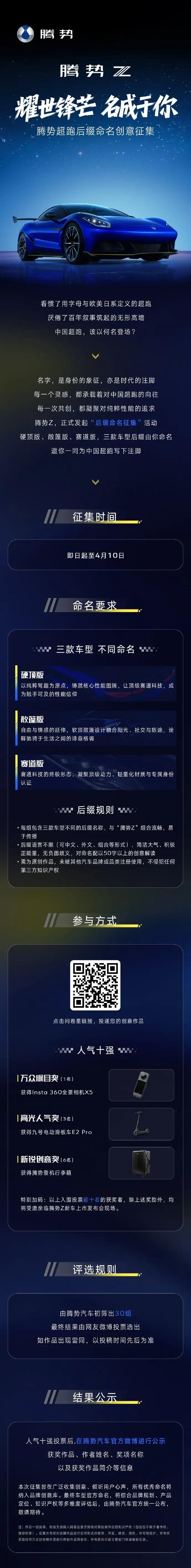 规则显示,每组包含三款车型不同的后缀名称,与“腾势 Z”组合流畅,易于传播;后缀语言不限(可中文、外文、组合等形式),简洁大气、积极正能量,无负面歧义,对命名配以 50 字以上的创意解读;需为原创作品,未被其他汽车品牌或品类注册使用,不侵犯任何第三方知识产权。